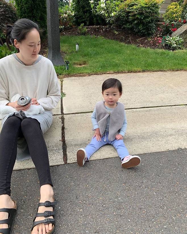 사진 속 혜박과 리아 양은 아스팔트 바닥에 앉아 편안한 포즈를 취하고 있다.