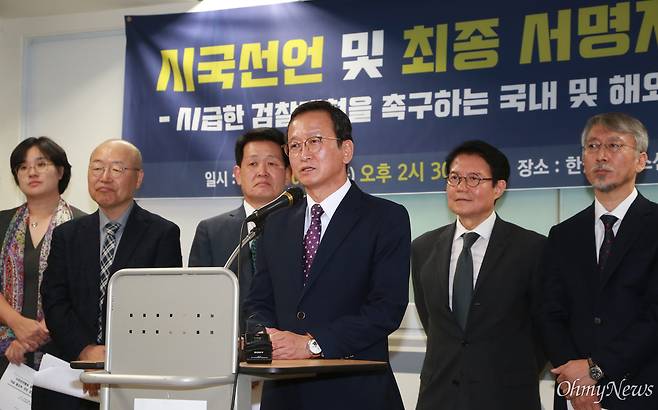 | ▲ 김호범 부산대 교수(대표 발의자)가 지난해 10월 11일 오후 서울 중구 프레스센터 언론노조 회의실에서 열린 '시급한 검찰개혁을 촉구하는 국내외 교수, 연구자 모임 시국선언 및 최종서명자 명단발표 기자회견'에서 발언하고 있다. |