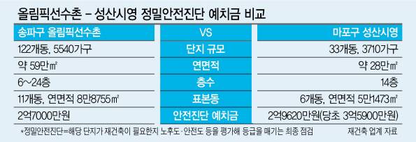 [헤럴드경제=민상식 기자] #서울 마포구청은 지난해 5월 당시 재건축을 추진 중이던 총 3710가구 규모 마포구 성산시영아파트의 정밀안전진단 비용(예치금)으로 3억5900만원을 산정해 주민들에게 통보했다. 하지만 주민들은 가구 수가 약 1800가구 더 많은 송파구 올림픽선수촌아파트의 비용이 9000만원 정도 낮다며 반발했다. 같은 시기에 서울 송파구청은 총 5540가구 규모 올림픽선수촌아파트의 안전진단 비용으로 2억7000만원을 책정했다. 반발이 커지자 마포구는 주민들과 비용을 2억9620만원 수준으로 협의했다.