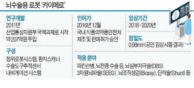 카이메로 상용화 성공에는 세브란스병원의 역할이 결정적이었다는 후문이다. 장진우 연세대 의과대학 신경외과 교수는 세브란스병원에서 2018년부터 카이메로 임상시험을 했다. 세계정위기능 신경외과학회(WSSFN) 학회장이기도 한 장 교수는 뇌정위기능 수술의 권위자로 꼽힌다. 그는 2년간 임상을 하면서 카이메로 정밀도의 오차범위를 0.98㎜로 좁혔다. 장 교수는 “카이메로 도입으로 국내 뇌수술 시간이 절반 정도로 단축될 뿐 아니라 정밀도도 크게 높아질 것”이라고 말했다.