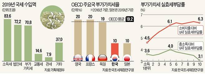 전문가들은 물건이나 서비스를 살 때 내는 부가가치세를 올리는 것이 합리적이라고 말한다. 모든 소비 행위에 같은 세율로 물리는 세금이기 때문에 조세의 보편성 원칙에 맞을뿐더러, 약간의 세율 인상으로도 큰 세수 증대 효과를 거둘 수 있어서다. 국내 부가가치세는 1977년 도입 이후 10%인 세율을 한 번도 올리지 않았다. OECD 국가들이 1960년대 말부터 평균 15% 수준의 부가가치세(소비세)를 도입한 뒤 꾸준히 세율을 인상한 것과 대조적이다. 이들 국가의 부가가치세율은 현재 20% 안팎이다.