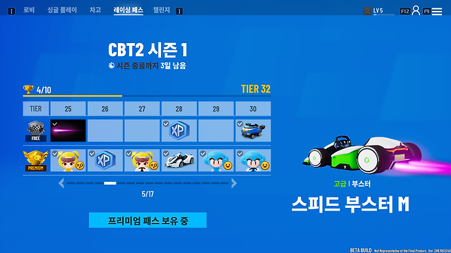 레이싱 패스와 함께 새로 도입된 챌린지는 가볍게 도전할 수 있는 일일 도전, 어렵지만 클리어하면 매주 더 많은 보상을 받을 수 있는 프리미엄 도전으로 나뉜다. 레이싱 패스 중 프리미엄은 별도 구매가 필요하나 이번 테스트에서는 무료로 제한없이 이용할 수 있다.