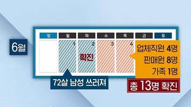 이후 오늘(4일)까지 업체 직원 4명과 판매원 8명, 판매원의 가족 1명까지 모두 13명이 줄줄이 확진됐습니다.