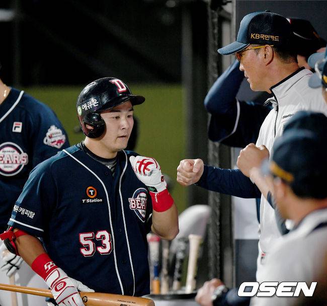 8회최 1사 상황 두산 최주환이 1점 홈런을 날린 뒤 더그아웃에서 하이파이브를 하고 있다./ksl0919@osen.co.kr