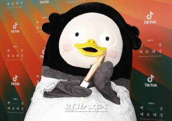 EBS '자이언트펭TV'의 펭수가 5일 오후 경기도 고양시 대화동 킨텍스에서 열린 ’제56회 백상예술대상' 시상식에서 TV부문 교양 작품상을 수상하고 포토타임을 갖고 있다.