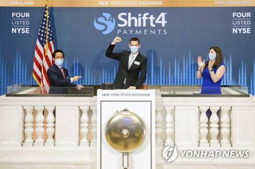 IMAGE DISTRIBUTED FOR THE NEW YORK STOCK EXCHANGE - Shift4 Payments, Inc. (NYSE: FOUR) rings The Opening Bell on Friday, June 5, 2020, in New York. The New York Stock Exchange welcomes Shift4 Payments, Inc. (NYSE: FOUR) in celebration of its IPO. To honor the occasion, Jared Isaacman, Chief Executive Officer, Christopher Cruz, Managing Director, Searchlight Capital, and Stacey Cunningham, NYSE President, ring the NYSE Opening Bell. (New York Stock Exchange via AP Images)