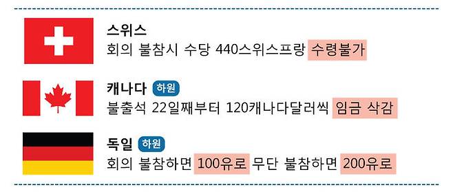 캐나다 하원의 경우도 비슷합니다. 불출석 횟수가 한 회기(1년)에 21일을 넘어가게 되면 그때부터 한 번 빠질 때마다 120캐나다달러, 한화로 10만 원이 넘는 돈을 임금에서 도로 내놔야 합니다.