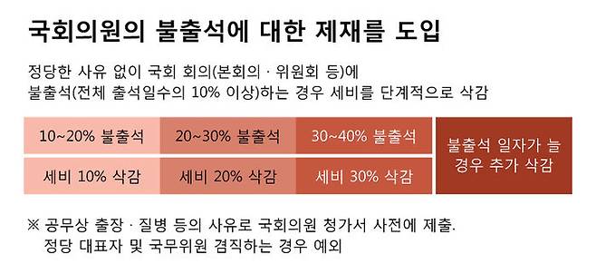 국회 의석 177석, 전체의 59%를 차지하고 있는 거대 여당 더불어민주당, 이미 총선 공약에서 출석률에 따라 얼마나 세비를 깎을지 적었습니다. 저희 이슈취재팀은 국민적 요구인 '무노동 무임금'에 대해 더는 선언에만 그치지 않겠다는 집권 여당의 의지로 해석했습니다. 이렇게 세부적인 안을 공약으로 제시한 것도 이번이 사실상 처음이기도 했습니다. 여당의 총선 공약, 다시 되뇌면서 글 마칩니다.
