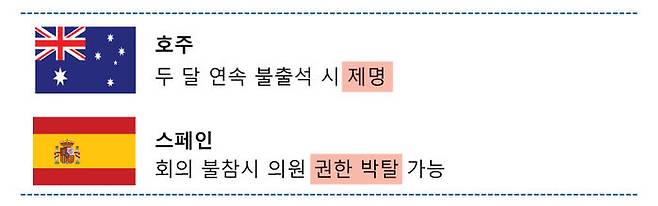 호주 국회가 이에 해당하는데요, 상•하원 가릴 것 없이 두 달 이상 연속으로 국회에 출석하지 않을 시 제명하도록 돼 있습니다.