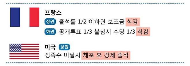 프랑스 상원에서는 소속 의원이 법안 표결이나 상임위 등에 참석했는지 조사하고, 만약 출석률이 절반에 미치지 못한다면 보조금을 깎는 제도를 지난 2015년부터 시행했습니다. 프랑스 하원도 비슷한데요, 한 회기 동안 열리는 공개투표의 1/3을 빼먹으면, 수당의 1/3도 받지 못하게 됩니다.
