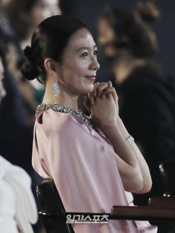 배우 김희애가 5일 오후 경기도 고양시 대화동 킨텍스에서 열린 ’제56회 백상예술대상'시상식에서 펼쳐진는 아역배우들의 축하무대를 지켜보고 있다.