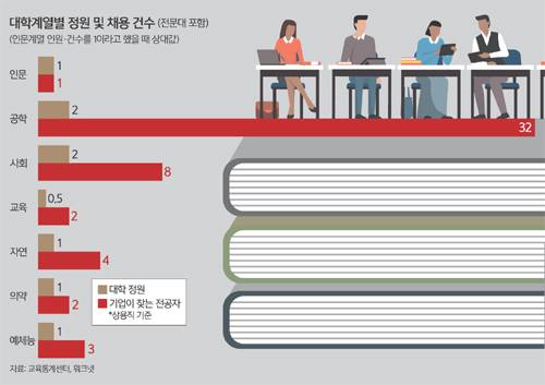 그런데 기업이 찾는 인재는 이 비율을 따르지 않는다. 인문계열 일자리가 1개 있을 때 공학계열은 32개, 사회계열은 8개, 자연계열 4개, 예체능계열 3개, 교육과 의약계열이 2개씩 올라온다. 세계일보가 3일 일자리포털 워크넷에 올라온 7만4972개의 채용공고를 선호 계열별로 나눈 결과다.
