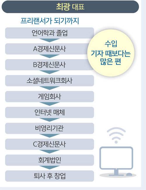 독특한 방식으로 ‘틈새시장’을 연 것이다. 직장인이었을 때의 이력도 평범하지 않다. 그가 몸담았던 회사를 읊어보면 경제신문사 두 군데를 거쳐 소셜네트워크회사, 게임회사, 인터넷 매체, 비영리기관, 또다시 경제신문사와 회계법인 등 8곳에 이른다. 잦은 이직은 경력에 마이너스가 아닐까.