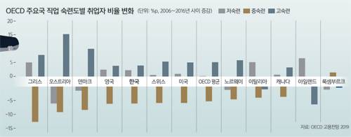 경제협력개발기구(OECD)의 ‘고용전망 2019’를 보면 2006년 이후 10년간 중숙련도 일자리비율(각종 사무직, 기계조작원 등)이 줄어든 국가는 30개 조사국 가운데 룩셈부르크를 제외한 29개국에 달했다. 고숙련도와 저숙련도의 일자리는 국가별 상황에 따라 증감이 달랐다.