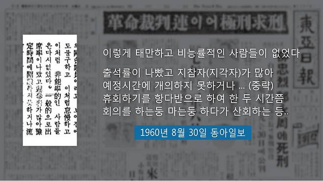 10년 뒤인 1960년 8월, 제5대 국회에서도 마찬가지였습니다. 동아일보 1면 사설의 한 구절. 뼈 때립니다. "이렇게 태만하고 비능률적인 사람들이 없었다. 출석률이 나빴고, 예정 시간에 개의하지 못하거나 까닭 없이 휴회하기가 다반사였고, 한두 시간쯤 회의하는 둥 마는 둥 하다 산회."