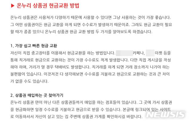블로그 등 사회관계망서비스(SNS)를 중심으로 온누리상품권을 현금화하는 방법을 일러주는 정보공유성 글도 잇따라 게시되며 확산하고 있다.