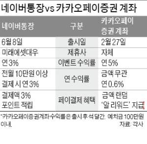 네이버통장은 공교롭게도 카카오페이증권 계좌 출시 이벤트가 모두 끝난 시점에 나왔다. 카카오페이는 같은 날 하나은행과의 제휴 통장을 선보이는 ‘정공법’을 택했다. ‘하나 카카오페이통장’은 우리, 농협, 기업은행 이후 네 번째로 은행과 제휴한 통장이다. 입출금식통장이지만 카카오페이머니의 충전 계좌로 등록하면 이체와 인출 수수료를 면제해준다.