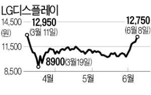 LG디스플레이는 8일 5.37% 오른 1만2750원에 장을 마쳤다. 월초 대비 15.00% 올랐다. 같은 기간 코스피지수 상승률(7.62%)의 두 배에 해당하는 상승폭이다. 코스피지수는 코로나19 사태로 폭락해 저점을 찍은 지난 3월 19일부터 이달 초까지 39.24% 올랐지만 LG디스플레이는 같은 기간 14.61% 상승하는 데 그쳤다. 그동안 주가가 못 올랐던 걸 이달 들어 만회하고 있다.