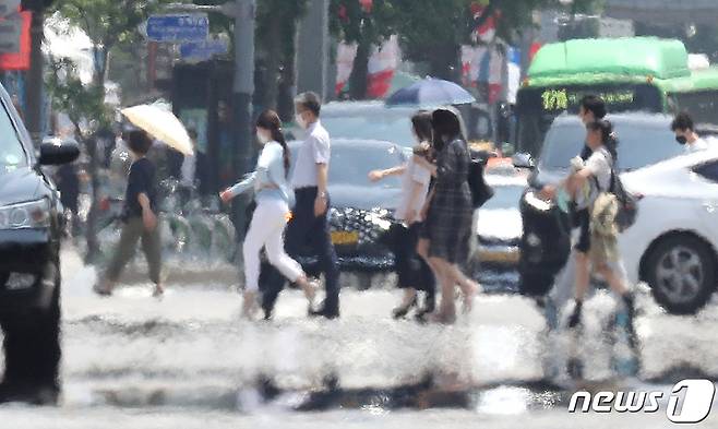 (서울=뉴스1) 이성철 기자 = 서울에 올해 첫 폭염주의보가 내려진 9일 오후 서울 종로구 광화문 인근 횡단보도를 건너는 시민들 앞으로 아지랑이가 피어오르고 있다. 2020.6.9/뉴스1