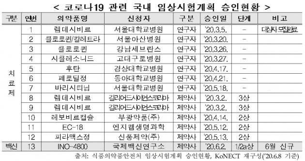 이밖에 부광약품이 레보비르캡슐(임상 승인일 4월14일), 엔지켐생명과학이 'EC-18'(5월12일), 신풍제약이 피라맥스정(5월13일)을 이용해 각각 치료제 임상 2상을 진행 중이다. 국제백신연구소는 백신 후보물질 'INO-4800'(6월2일)에 대해 임상 1·2a상을 하고 있다.