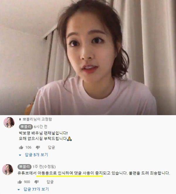댓글 기능이 중지된 이유는 아동 인권 보호를 위해 아동용 채널로 인식될 경우 광고 및 댓글 기능을 중단시키는 유튜브의 방침 때문이었는데요, 인공지능이 영상에 등장하는 사람의 얼굴로 연령대를 자동 인식하기 때문에 박보영의 팬 채널이 아동용으로 분류됐던 겁니다.