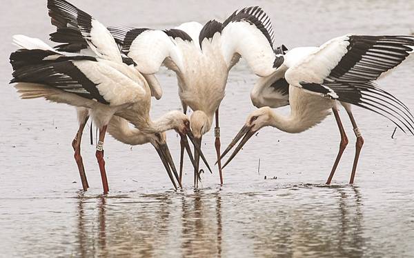 천연기념물 199호로 멸종위기종인 황새들이 9일 충남 예산군 광시면 예당호 지류에서 먹이사냥을 하고 있다. 연합뉴스
