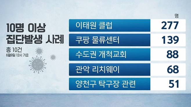 지난달 6일 생활 속 거리 두기가 시작된 뒤 감염자가 10명 넘게 나온 집단감염 사례는 모두 10건입니다.