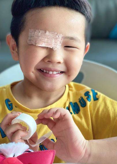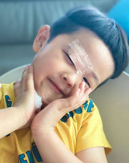 함께 공개한 사진 속에는 아들 준우 군이 눈 위 상처를 꿰매고서도 밝게 웃는 모습이 담겨있다.