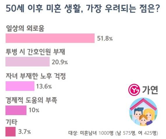 결혼정보회사 가연과 여론조사 전문기업 리얼미터가 조사한 바에 따르면, 미혼남녀 2명 중 1명(51.8%)이 50세 이후 미혼 생활에서 가장 우려되는 점으로 ‘일상의 외로움’을 꼽았다. 이밖에 투병 시 간호인원 부재(20.9%), 자녀 부재한 노후 걱정(13.6%), 경제적 도움의 부족(10%), 기타(3.7%) 순으로 이어졌다. (대상: 만 19세 이상 44세 이하 미혼인 1000명 남 575명, 여 425명)