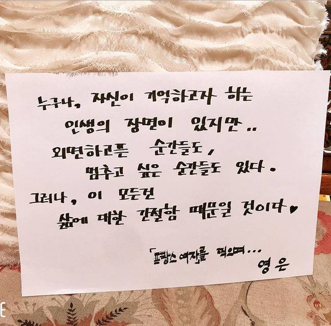 김지영은 '프랑스 여자' 관람을 독려하며 각별한 애정을 담아 인스타그램에 전단지 인증샷과 영화감독 ‘영은’이었던 촬영 당시 진솔하고 담백한 소회를 담아낸 자필 메모를 공개했다.