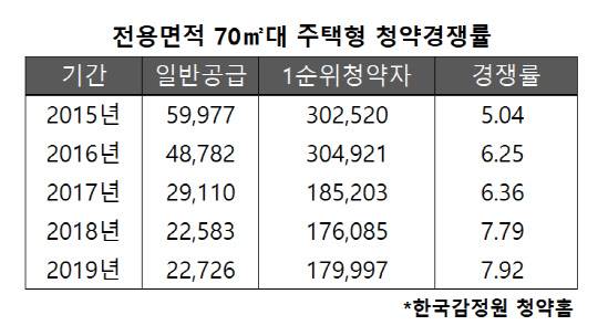 한국감정원 청약홈 자료를 통해볼 때도 틈새면적의 청약경쟁률이 점차 상승하고 있다. 2015년부터 5년간 전국에서 일반분양된 전용면적 70㎡대 주택형의 1순위 청약경쟁률에서 2015년 5.04대 1이던 수치는 해마다 올라 2019년에는 7.92대 1을 기록한 것으로 나타났다.