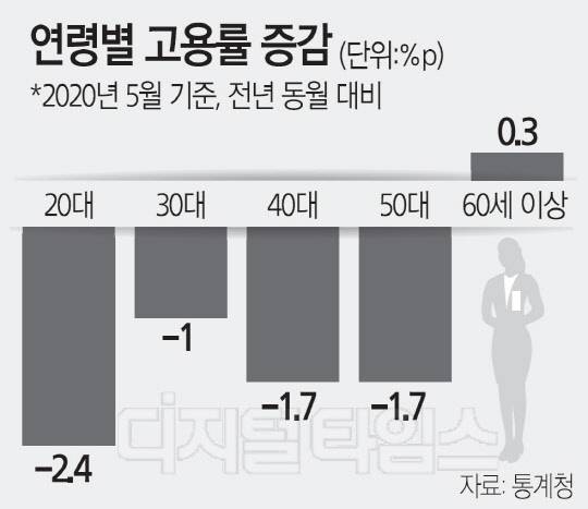 이날 통계청이 발표한 '고용동향'을 보면 5월 20~29세 취업자 수는 1년 전과 비교해 13만4000명 감소했다. 고용률도 마이너스(-) 2.4%p를 기록하며 전 연령층 가운데 낙폭이 가장 컸다.