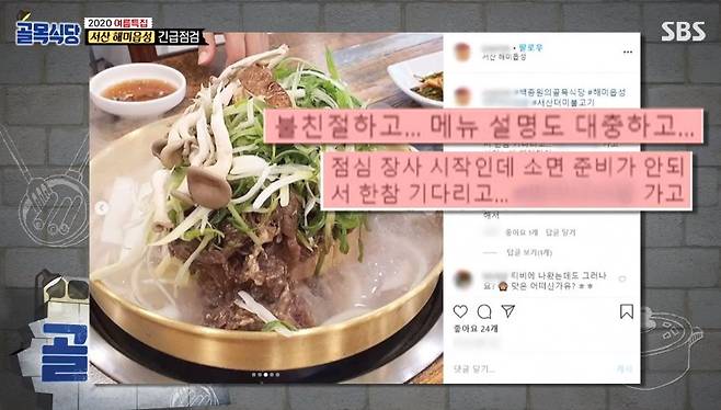 나아가 긴장한 불고깃집 사장을 앞에 두고 “SNS에 안 좋은 후기가 많다. 친절하지 않다는 글도 있었다”고 대놓고 말했다. 이에 불고깃집 사장은 “최선을 다하고 있다. 손님들이 오면 깍듯하게 한다. 그런데 손님들이 우릴 만족 못하나보다”고 해명했다.