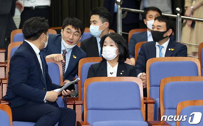 (서울=뉴스1) 박세연 기자 = 윤미향 더불어민주당 의원이 12일 오후 서울 여의도 국회에서 열린 의원총회에 참석해 동료 의원들과 함께 자리하고 있다. 2020.6.12/뉴스1