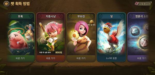이 밖에도 펫을 얻을 수 있는 여러 가지 방법이 있다. '포획'에는 수동 포획 외에도 '조련사의 밧줄' 아이템을 사용하여 펫을 획득하는, 일종의 뽑기 시스템인 '즉시 포획'이 있다. '부화장'은 정예 사냥 등의 미션 보상으로 획득한 '펫의 알'을 부화시키는 장소다. 일정한 시간이 지난 후 알에서 깨어난 펫을 획득할 수 있다. 또한 펫의 성장 재료인 '영혼석'을 필요한 개수만큼 모으면, 살아있는 펫으로 소환이 가능해진다.