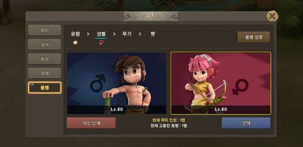 만약, 혼자서 부담 없이 파티 플레이의 매력을 만끽하고 싶다면? '용병' 시스템을 활용해 보자. 파티장인 조련사 1인은 한 파티에 최대 2명까지 용병을 고용할 수 있다. 이때 소모할 재화의 종류에 따라 용병의 전투력과 전투에서 사용할 무기, 펫 유형에 대한 선택이 가능하다. 용병 역시 탑승펫과 전투 펫 1마리를 데리고 파티에 참전하므로, 일반적인 파티원과 유사한 능력치를 보유하고 있다.