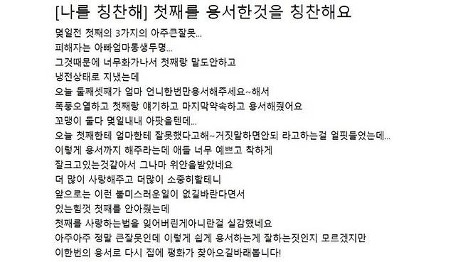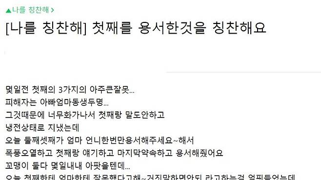 작성자는 "[나를 칭찬해] 첫째를 용서한 것을 칭찬해요"라는 제목의 글을 올렸습니다.