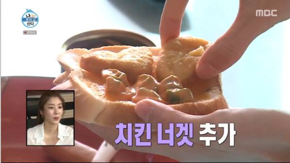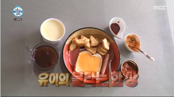 이후 유이는 식빵에 치즈를 올려 전자레인지에 돌린 다음 치킨너겟, 매운 소스를 올려 아침 식사를 했다.