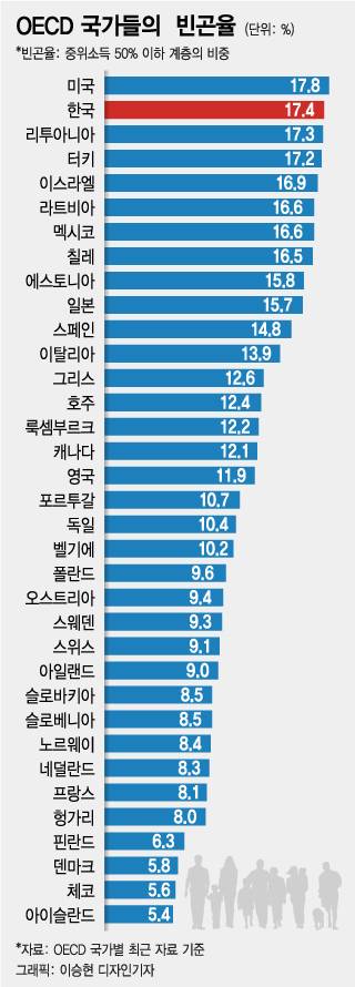 한국경제가 처한 빈곤의 문제는 OECD의 통계를 보더라도 여실히 드러난다. 2017년 기준 OECD 빈곤율(중위 소득의 50% 이하인 계층의 비중)은 17.4%로 OECD 35개 국가 중 미국 다음으로 높다.