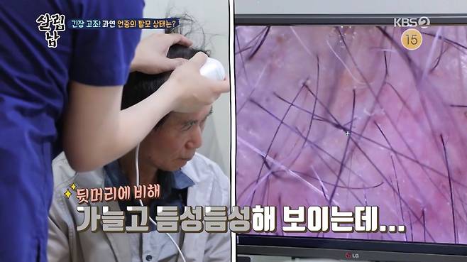 의사 선생님은 "뒷머리 머리카락 굵기는 젊은 사람 못지 않지만, 앞머리는 죽어가는 중이"라는 충격적 진단을 내렸다. "머지않아 초토화 될 거다. 조만간 민둥산화 될거라"라고도 덧붙였다.