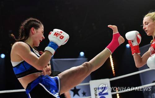 epa08483826 Polish kickboxers Dominika Filec (blue) fights with Marta Waliczek (red) during the Kickboxing Tournament at the Polish TV studio in Warsaw, Poland, 13 June 2020. Due to the coronavirus Covid-19 pandemic, no audience was present at the Kickboxing Tournament. The tournament could be followed via Polish Television. EPA/Piotr Nowak POLAND OUT