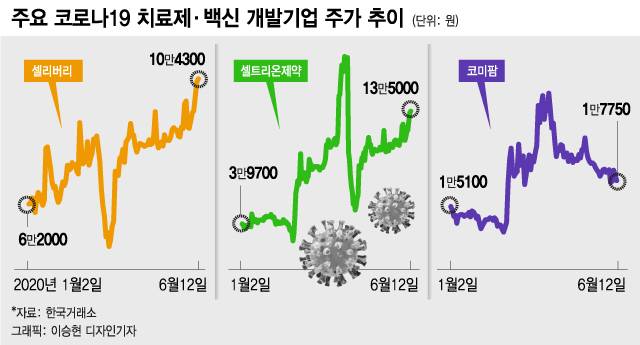 이 밖에 한국유나이티드제약, 셀리버리, 유틸렉스, 지노믹트리, 젬백스, 일양약품, 부광약품 등은 치료제 및 백신 개발을 발표한 뒤 상승한 주가를 대체로 유지하거나 완만한 상승 곡선을 그리고 있다. 특히 셀트리온제약은 지난 3월 4만원대에서 최근 13만원대까지 주가가 계속 상승하고 있다.
