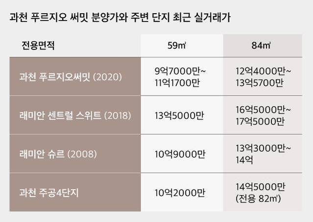 여경희 부동산114 수석연구원은 "인근 ‘과천 센트럴 센트럴 파크 푸르지오 써밋’이나 ‘과천 위버필드’의 일부 입주·분양권 거래 사례를 보면, 전용면적 59㎡를 기준으로 분양가 프리미엄이 2억원 초중반대에 형성됐다"며 "과천 푸르지오 써밋도 마찬가지 흐름을 보일 것"이라고 분석했다.