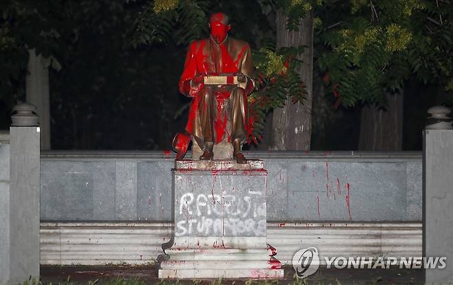 이탈리아 밀라노에 세워져 있는 저명한 언론인이자 역사 저술가인 인드로 몬타넬리(1909∼2001)의 동상이 13일(현지시간) 인종차별에 항의하는 시위대에 의해 붉은색 페인트가 뿌려져 있고 기단에는 '인종차별주의자, 강간범'이란 낙서가 돼 있다.