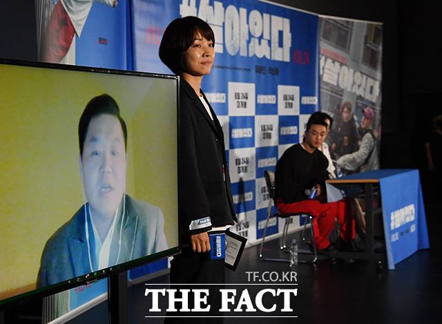 조일형 감독(왼쪽)이 15일 오후 서울 광진구 롯데시네마 건대입구점에서 열린 영화 '#살아있다' 언론시사회에 화상으로 참석해 취재진의 질문에 답변을 하고 있다.