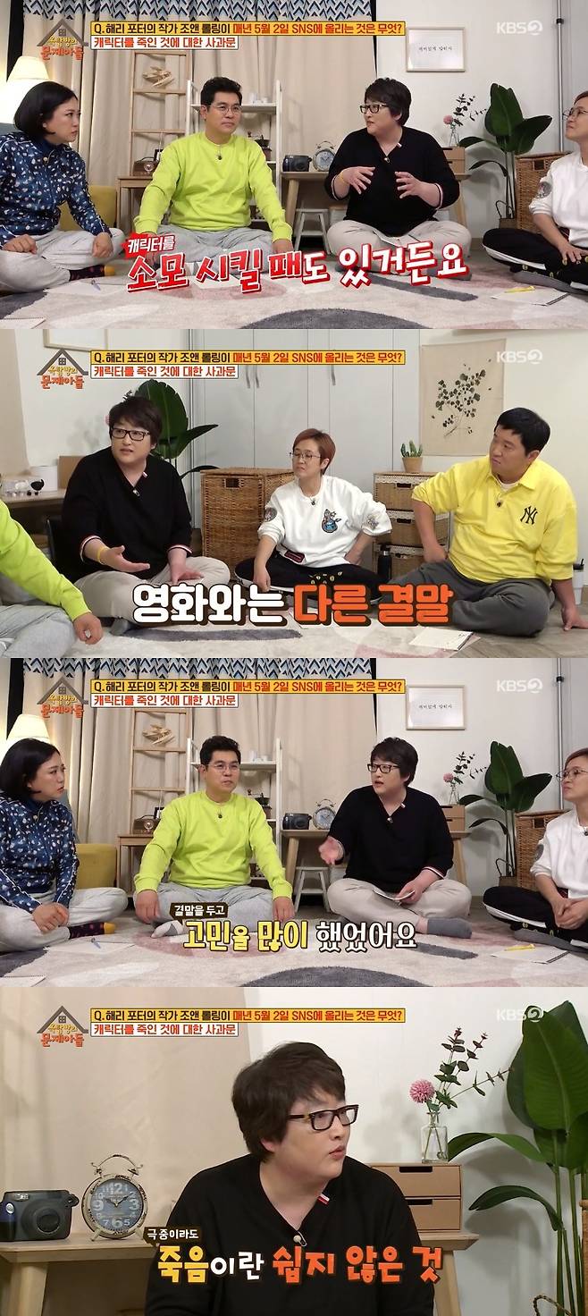 MC들과 변영주 감독은 한참 고민했고, 정답은 '해리포터' 속 캐릭터를 죽인 것에 대한 사과문이었다. 실제로 조앤 롤링은 해마다 캐릭터들을 추모하다가 올해 5월 2일에는 "코로나로 인해 현실에서 죽는 사람이 많아 허구의 죽음을 추모하지 않겠다"고 밝혔다고.