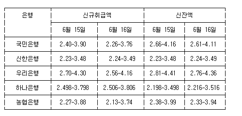 국민은행은 2.26∼3.76%로, 우리은행은 2.56∼4.16%, 농협은행은 2.13∼3.74%로 각각 내렸다.