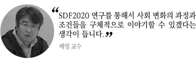 한국사회가 코로나19로 목도 할 수 있는 여러 가지 변화 중에 굉장히 커다란 패러다임의 변화가 있지 않나 하는 생각을 하는데요. 우리 사회가 굉장히 화가 많은 사회라고 이야기를 하는데요. 한국사회는 여러 정치적 경험을 했고 그런 학습 과정에서 '분노'가 갖는 효과가 굉장히 컸던 것 같아요. 하지만 코로나19를 겪으면서 '분노'가 효능감을 가졌던 사회에서 '연대'와 '협력'의 효능감 사회로 넘어가고 있지 않나, SDF2020 연구를 통해서 과거와는 다른 차원의 사회로 가고 있는 그런 지점들을 발견할 수 있지 않을까? 하는 생각이고요. 인간이 착하기 때문에 협력이나 연대를 하는 거라고 생각하지 않습니다. 학습을 통한 경험이 축적되고, 그것이 충분히 의미 있다는 것을 경험하면서 가능해지는 것 같은데요. SDF2020을 통해 이러한 사회 변화 과정과 조건들을 구체적으로 이야기 할 수 있겠다는 생각이 듭니다.