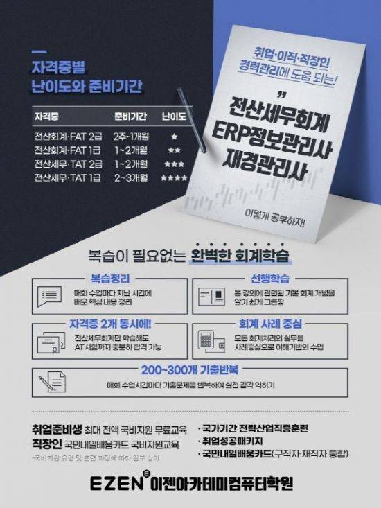 이젠아카데미컴퓨터학원, 경영관리전문가 전산세무회계·ERP정보관리사·재경관리사 국비교육으로 자격증 및 회계 실무역량 높이려면