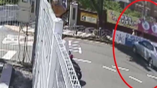 SUV 차량과 충돌한 뒤 갑자기 속도를 내며 스쿨존 보행로로 돌진하는 승용차.